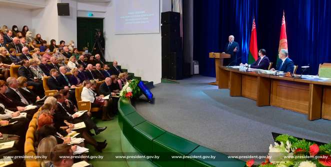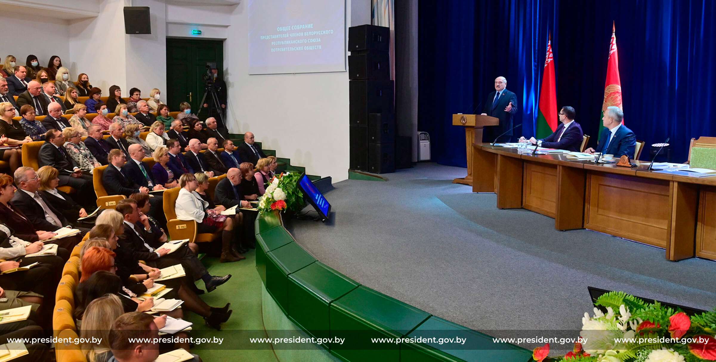 А это общее собрание представителей Белкоопсоюза 8 октября во Дворце республики, участие в котором принимали 450 человек со всей страны и Александр Лукашенко. Сравните число людей в масках. Фото: president.gov.by
