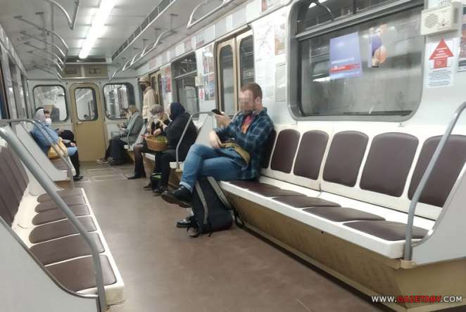 В метро сограждане также демонстрируют удивительную сознательность: в вагоне из 20 человек без маски только молодой мужчина – причем от «Спортивной» до «Купаловской» он так и остается единственным нарушителем противокоронавирусных мер.