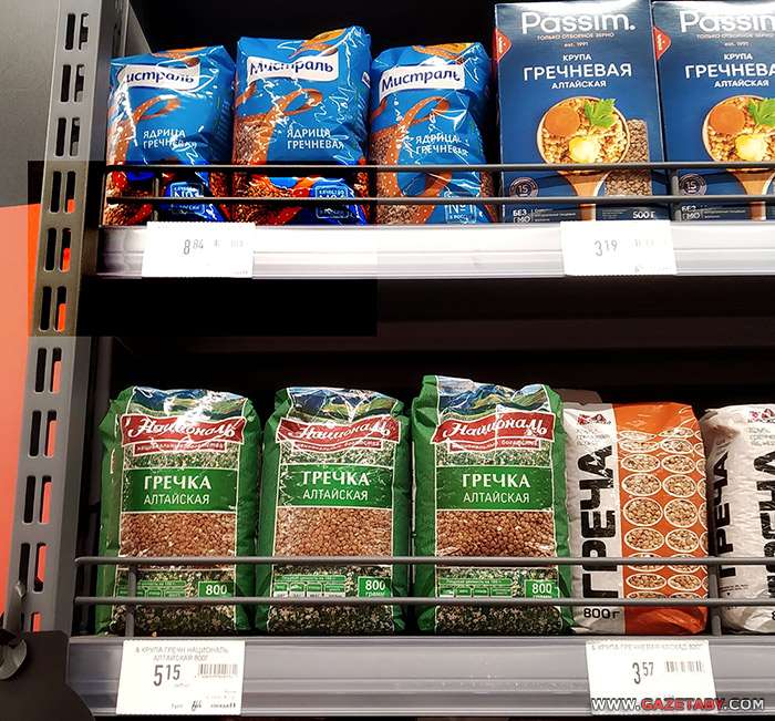 Сворачивая к крупам, убеждаемся в наблюдательности женщин – более того, обнаруживаем «гречку-рекордсмен» из России – пачка 0,8 кило стоит почти 9 рублей.