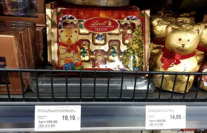 …Из кондитерских секций магазинов совсем скоро могут исчезнуть швейцарские шоколадки и конфеты Lindt и Toblerone, бельгийские шоколадные «ракушки», немецкие Schogetten, жевательные мармеладки Harribo родом из Венгрии. Возможно, поэтому здесь уже сейчас ажиотаж – довольно активно разбирают как подарочные коробочки, так и конфеты на вес.