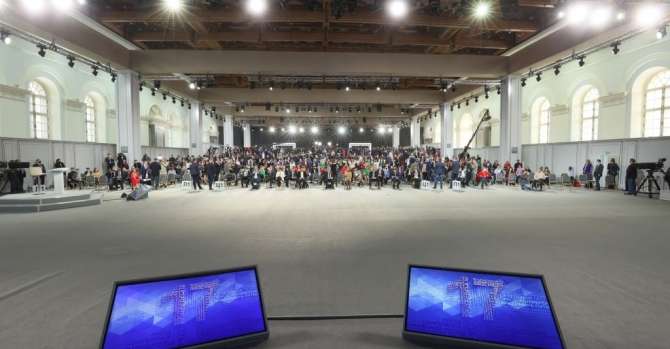 Не говоря уже о некоторых особенностях этого сезона, если это называть сериальными сезонами. Кремль сам выбирал журналистов. Проводилось очно, но расстояние между сидевшими за столом и журналистами было такое, что Владимир Владимирович не узнал Ксюшу Собчак и сам сказал об этом — как далеко это. И Песков в самом начале сказал: «Что-то я там не вижу, далеко».