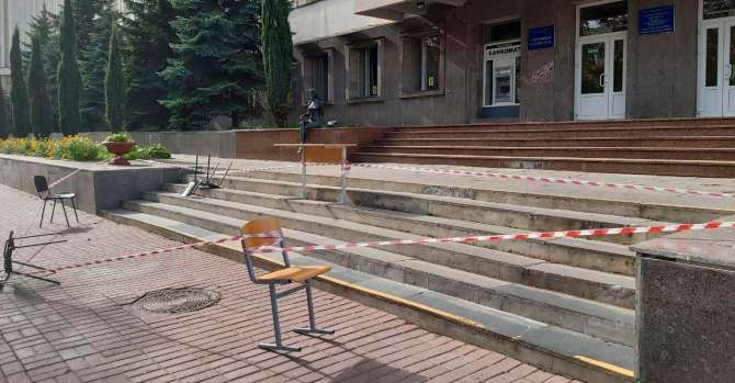 30 сентября 2020-го. Пятый корпус ГГУ им. Ф.Скорины. В очередной день одиночных и массовых протестов студентов администрация огородила ступени перед входом в здание. Архивное фото