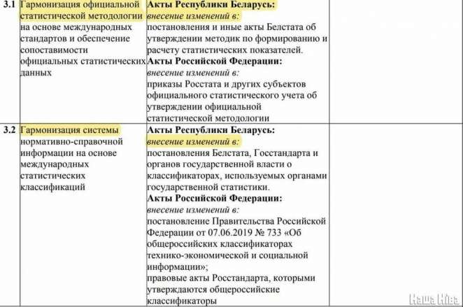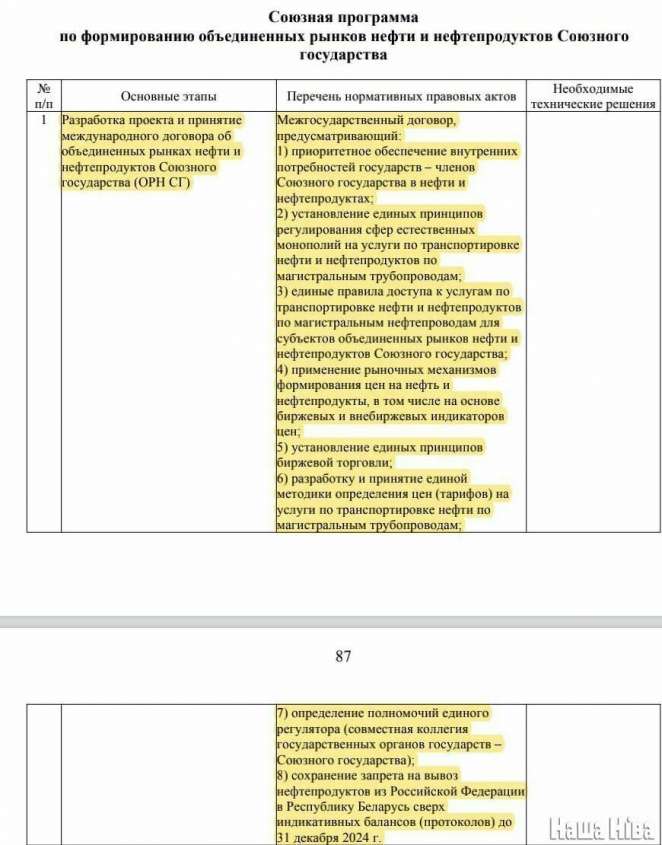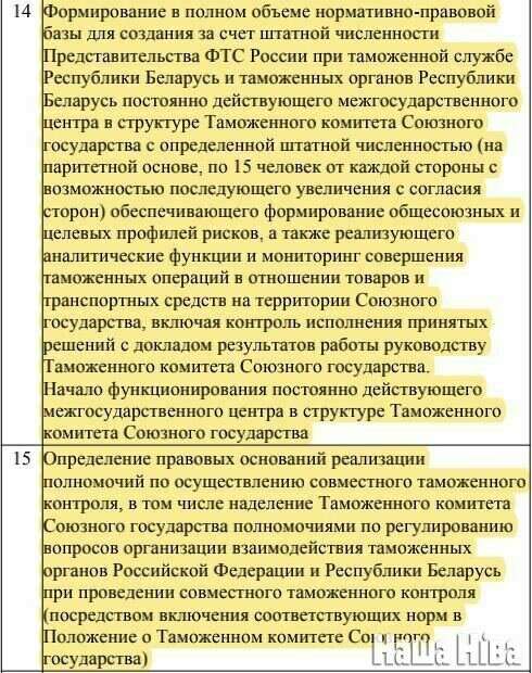 Там много общих моментов: «гармонизация правил дорожного движения», «определение порядка маркировки товаров» и др. Но прописаны и моменты, которые ставят крест на суверенитете и независимости Беларуси в обмен на дешевые газ и нефть: идет речь о введении наднациональных органов, гармонизации налогового и таможенного законодательства.