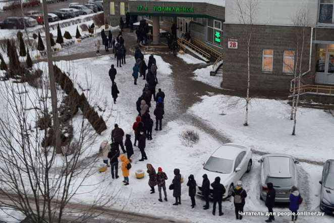 Пользователь, приславший снимки от 13-й поликлиники Минска, переживает: люди остынут, пока до них дойдет очередь.