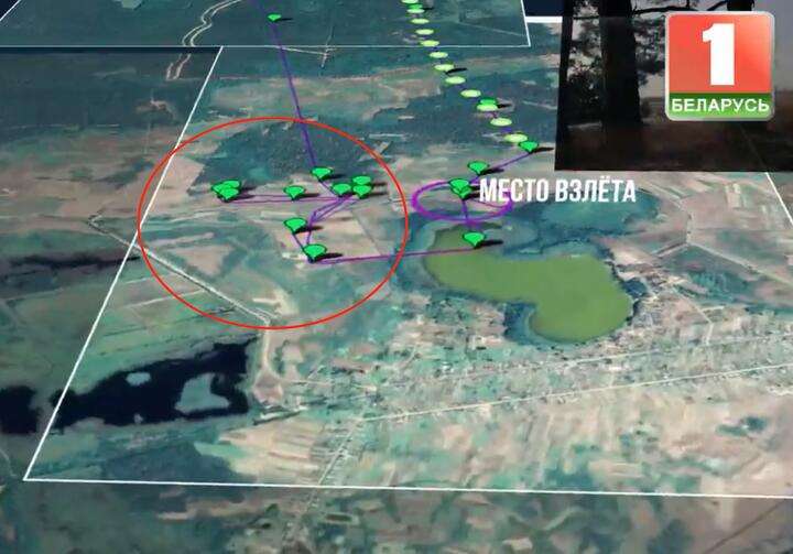 Фиолетовая линия — неизвестная часть маршрута движения БПЛА. Скриншот видео: «Беларусь 1»