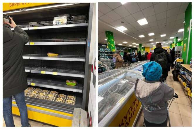 Продавцы сравнивают ажиотаж на продукты с началом пандемии коронавируса в 2020 году. А пустые полки в нескольких магазинах объясняют тем, что на выходных не было новых поставок, а люди закупались достаточно активно.
