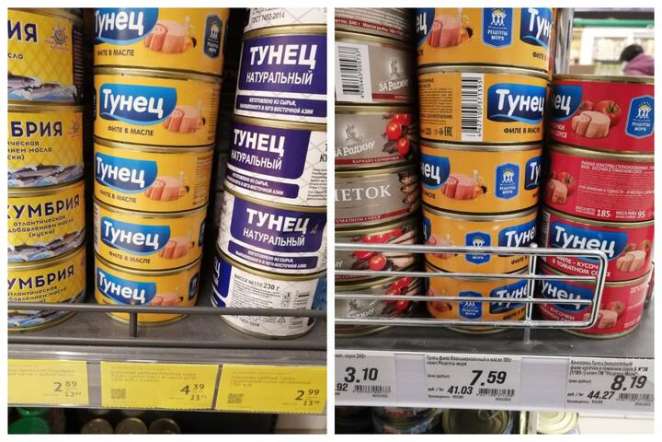 Цена на тунец в двух разных магазинах. Фото читателя