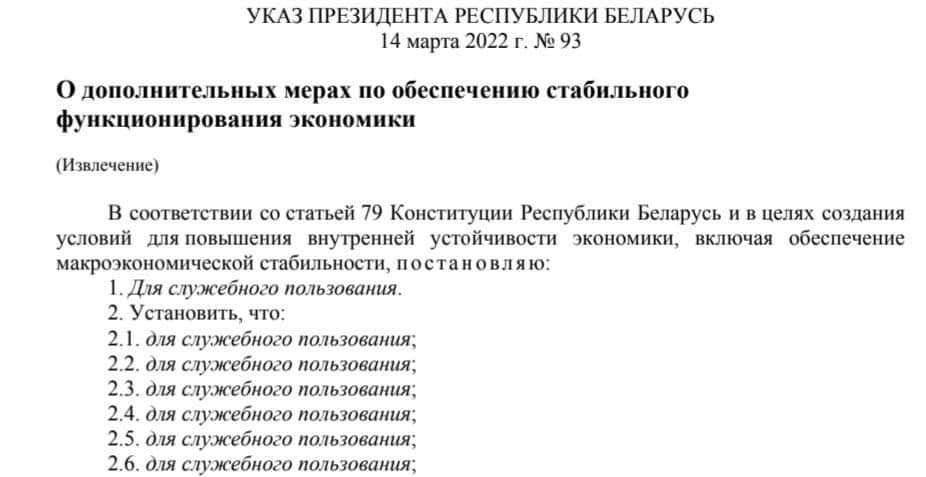 Два указа Лукашенко, подписанные в марте, изобилуют пунктами «для служебного пользования»: «О дополнительных мерах по обеспечению стабильного функционирования экономики» и «О распоряжении имуществом».
