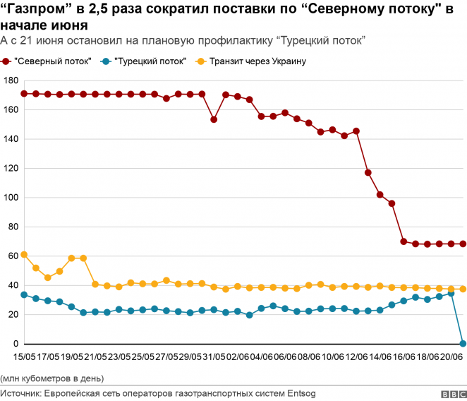 Очередное сокращение объясняется плановой профилактикой на одном из трех газопроводных маршрутов из России в Европу — южном, через Турцию. Она закончится через неделю, однако в июле предстоит ремонт основного трубопровода «Северный поток» в Германию.