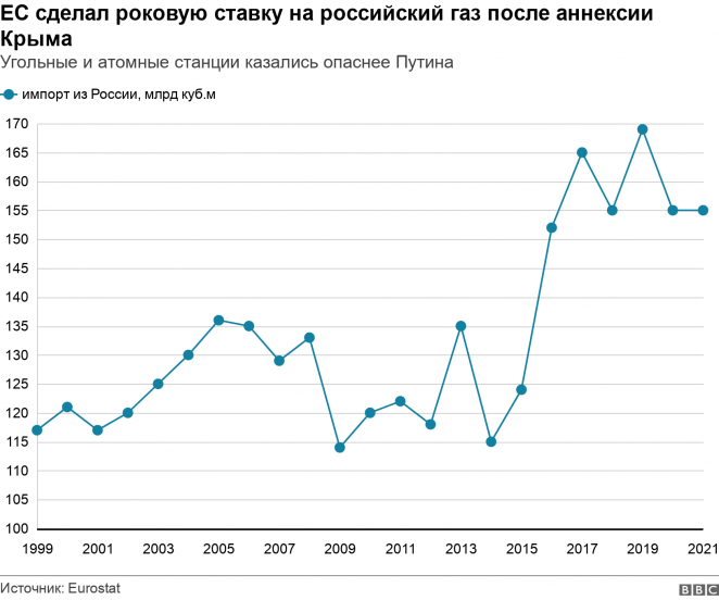 За два с лишним десятилетия правления Путина ЕС увеличил закупки российского газа в полтора раза. Теперь же Европа собирается сократить их на две трети всего за несколько месяцев.