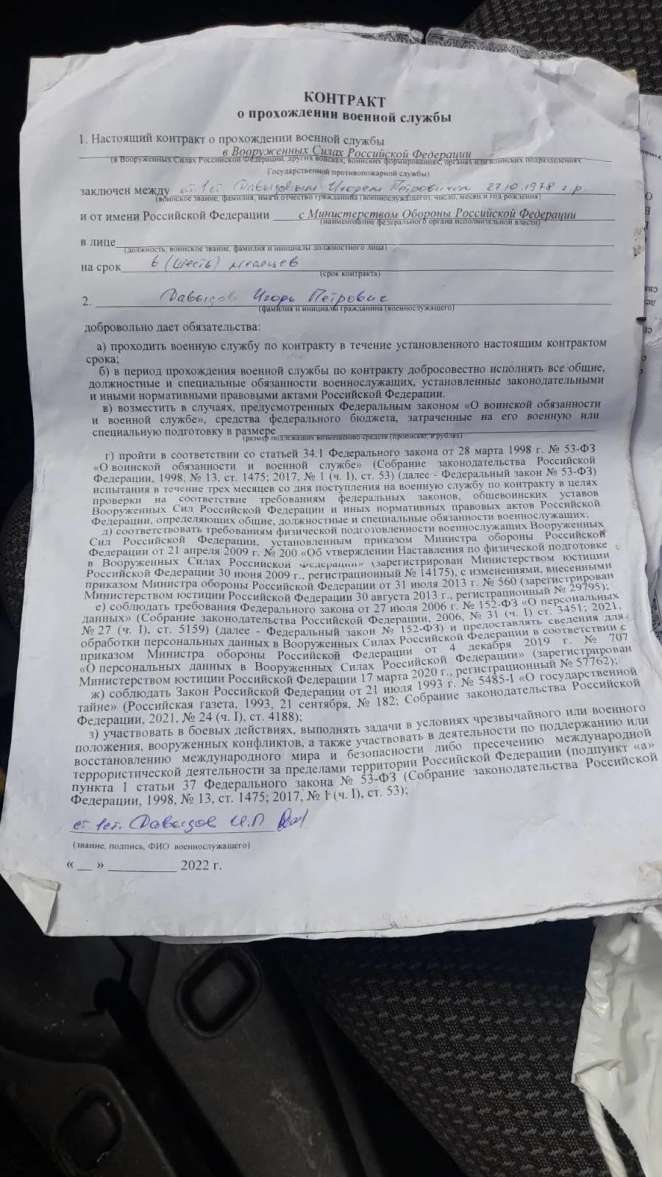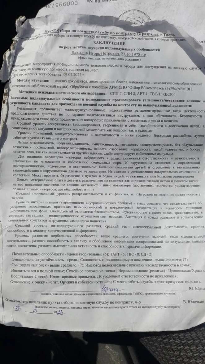 Начальник пункта отбора по контракту подписал психиатрическое заключение по Давыдову 6 июля. То есть после этого его должны были оформить на службу, заключить контракт, направить на место службы, направить на фронт, вывести на позиции. Времени на подготовку фактически не было. Очевидно, Давыдов и Селянин поехали в 752-й полк в одной команде, оба были «шестимесячниками».