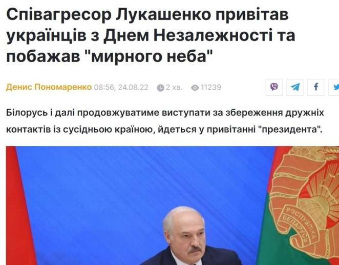 «Самопровозглашенный президент Беларуси Александр Лукашенко и соучастник военных преступлений России на украинской земле поздравил Украину с Днем независимости», — пишет «Униан».