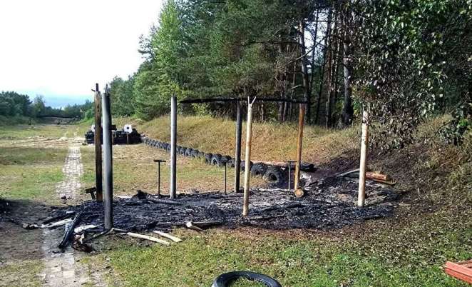 Далее снова рассказывает Ермолович — об акции с поджогом тира, принадлежавшего войсковой части 5527. Он говорит, что они стянули колеса, которые лежали в качестве ограждения, нашли еще какие-то доски, сложили все вместе и подожгли. Произошло это с 23 на 24 сентября 2021 года.