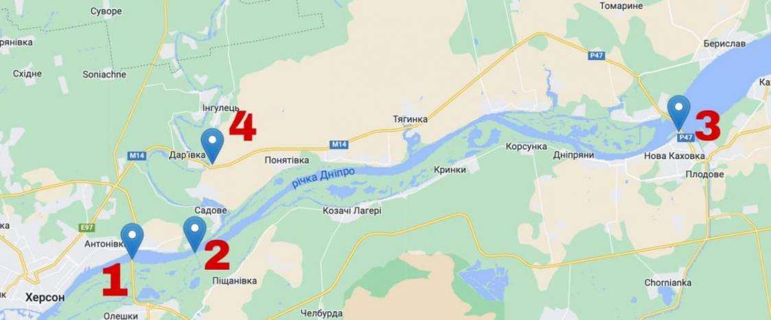 Для россиян отрезаны основные пути отступления — Антоновские мосты (1,2), мост у Каховской ГЭС (3) и мост через реку Ингулец (4). Всё это пахнет изоляцией района боевых действий / Всевидящее ОКО
