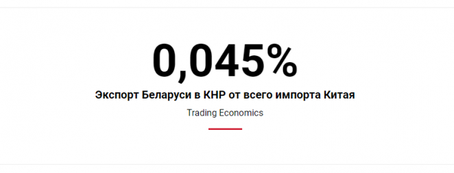 Согласно ресурсу Trading Economics среди импортеров в Китай в 2021 году Беларусь с $1,1 млрд (Белстат оценивает экспорт в Китай в $1,3 млрд, но включает туда Гонконг, Макао и Тайвань) расположилась аж на 83 месте. То есть наша страна значительно уступает по экспорту в КНР таким государствам как Польша, Венгрия, Узбекистан, Казахстан, Украина, Болгария, Словакия и Чехия.