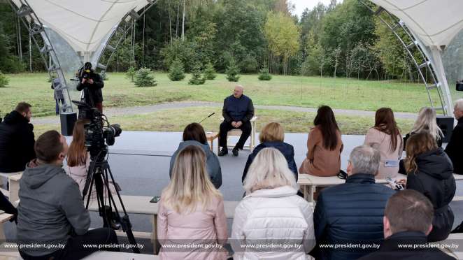 Все это он делал в походном варианте – исключительно стоя. Но неделю назад после ознакомления со строительством музея в мемориальном комплексе «Хатынь» Лукашенко и сам присел на стул, и молодых журналистов усадил на лавочки.
