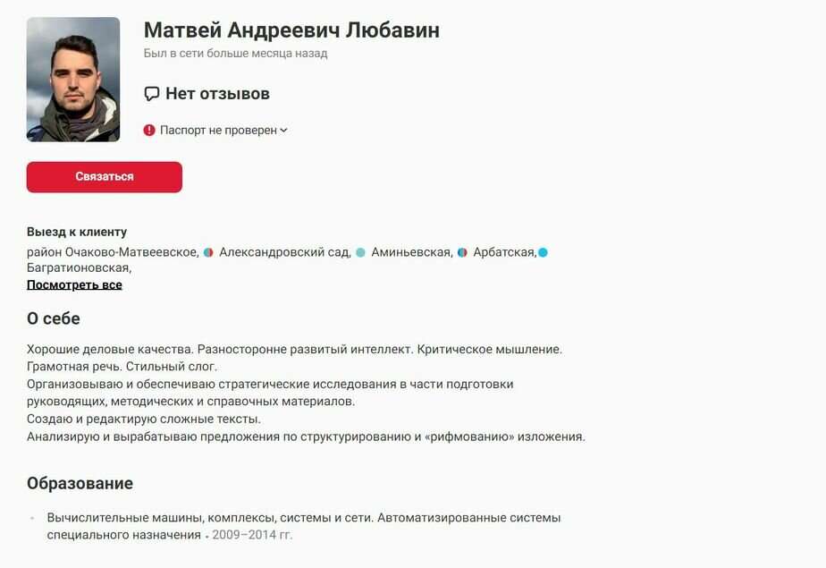 К 2020 году Любавин уже работал в ГВЦ. Согласно его собственному резюме, размещенному на сайте поиска работы для фрилансеров в марте 2022 года, он получил благодарность от президента России. Любопытно, что после начала войны Любавин, по-видимому, считал, что его основная работа в ГВЦ не мешает ему работать в сфере копирайтинга и редактирования — в самом деле, не пропадать же «разносторонне развитому интеллекту» с «критическим мышлением» и «стильным слогом» (что бы это ни значило).