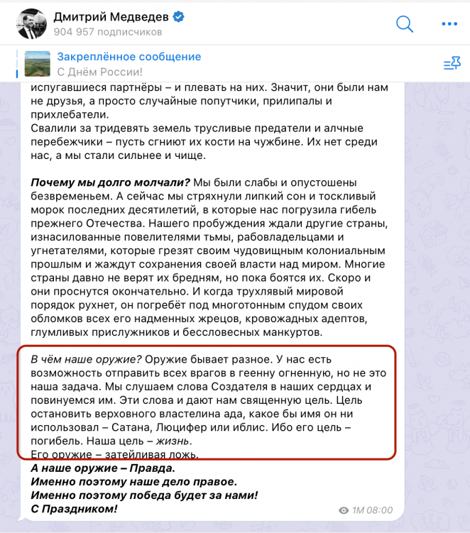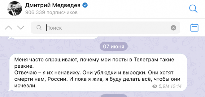 Есть еще одна причина, почему в телеграме Медведева появляется открытая дичь. В последнее время он вовсе не тяжеловес в российской политике. И эта активность в телеграме — один из немногих вариантов для него, чтобы оставаться в публичном пространстве, считает Саморуков.