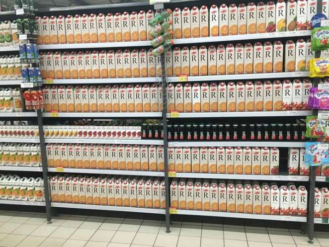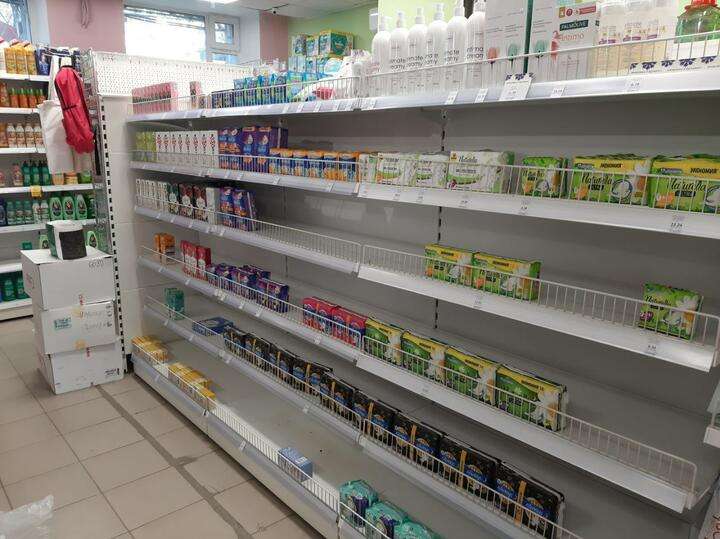 Но уже сейчас можно заметить, что ассортимент продуктов и непродовольственных товаров в магазинах стал более скудным. А торговые стеллажи нередко заставлены не привычным битком, а по несколько единиц разных товаров. Бывает и такое, что весь стеллаж заполнен только одним видом продукта, а альтернативы либо нет вообще, либо она очень скудная. Как на фото ниже.