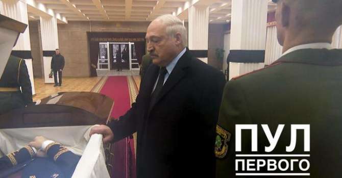 Судя по опубликованным фото, Александр Лукашенко появился на церемонии в самом начале. Других посетителей, кроме него, в помещении в этот момент не было. Политик принес к гробу министра букет темно-красных роз, большой венок из таких же роз от его имени возложили военные.