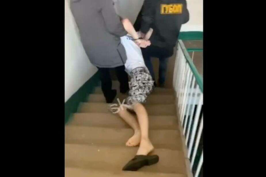 Кадр из видео задержания в Витебске в ноябре: мужчину полуголым тащат по лестнице во двор, на мороз. Скриншот из видео ГУБОПиКа