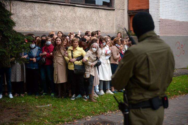 Женщины закрыли собой мужчин перед силовиками на протестах в сентябре 2020 года. Фото: Евгений Ерчак/EPA