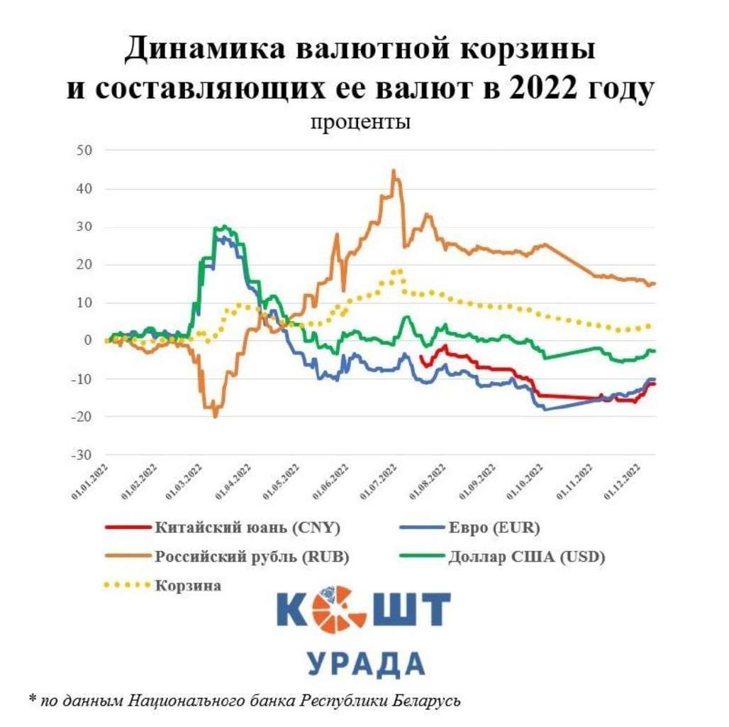 Валютная корзина — это метод, которым пользуется нацбанк для того, чтобы устанавливать курс беларуского рубля на бирже. Суть здесь заключается в следующем. Представьте, что на очередных валютных торгах курс российского рубля сильно вырос, юаня – вырос незначительно, евро – немного снизился, а доллара – заметно упал. Так что же в итоге произошло с беларуским рублем, ослабел он или укрепился? Ответ на этот вопрос помогает получить валютная корзина, вернее, ее динамика. По специальной формуле с учетом изменившихся курсов всех иностранных валют можно рассчитать значение корзины и отследить изменения, увидеть, выросла она или, наоборот, снизилась.