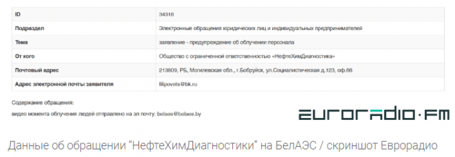В теме обращения указано: «Заявление — предупреждение об облучении персонала». А в его тексте сказано, что видео момента облучения людей отправлено на электронную почту [email protected]. Это официальный контактный мэйл администрации БелАЭС.