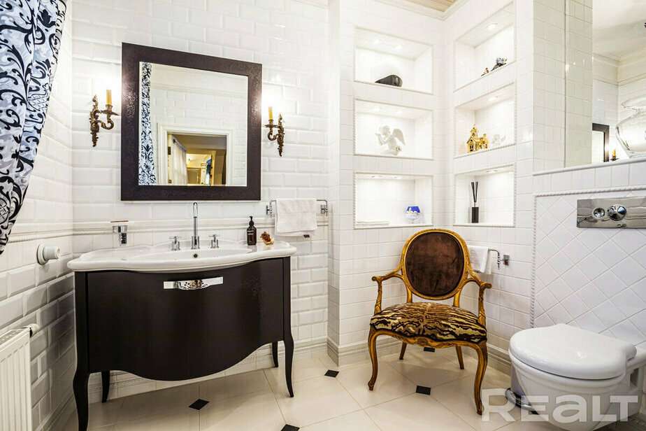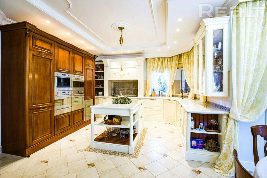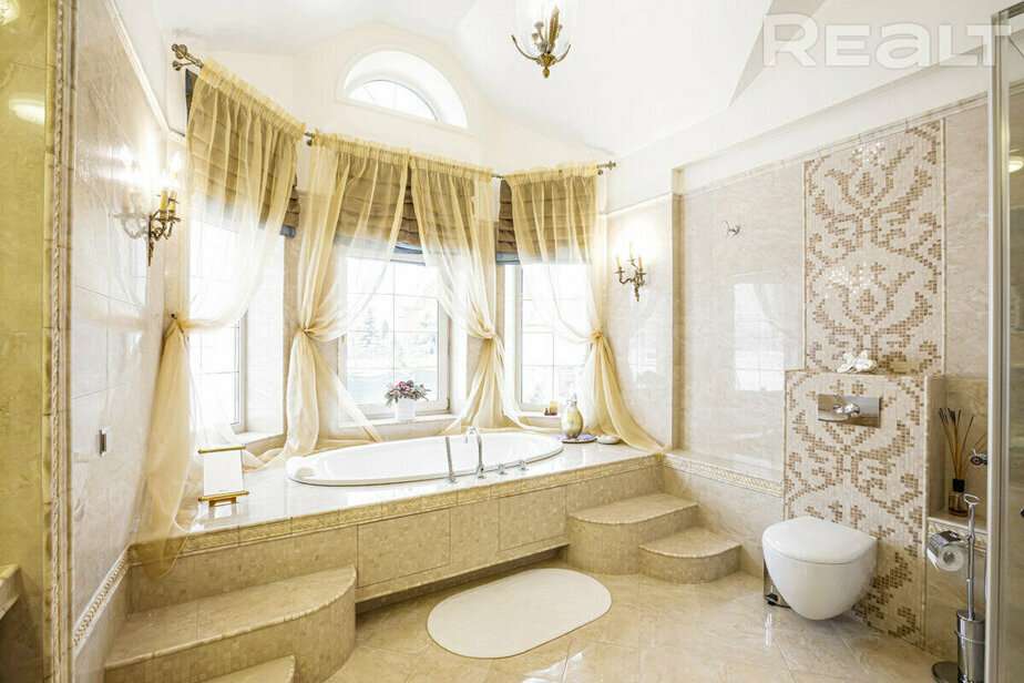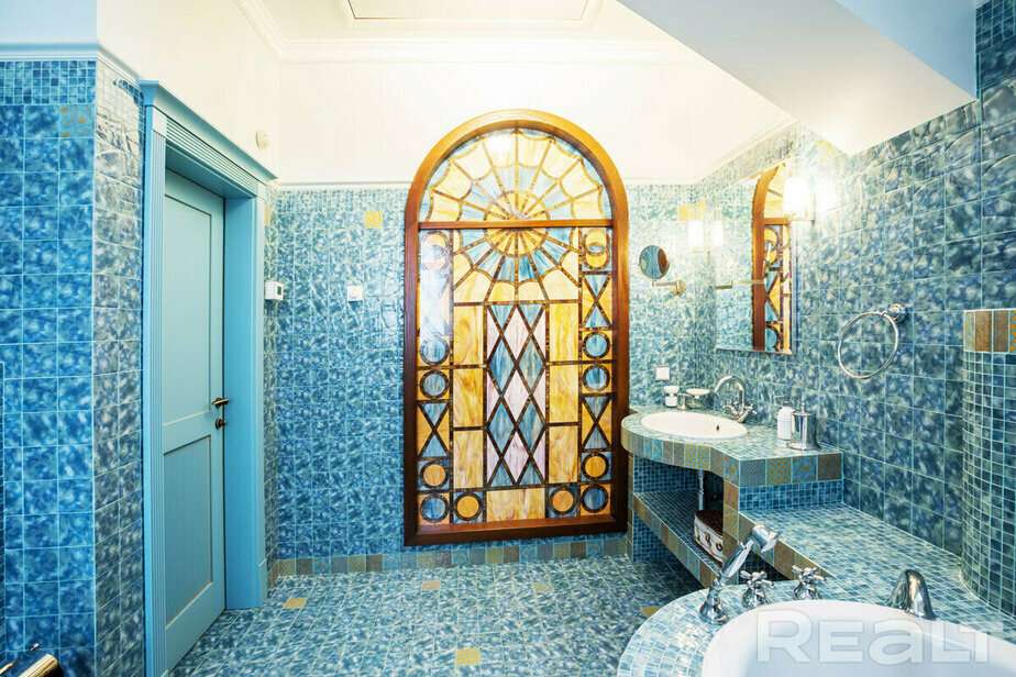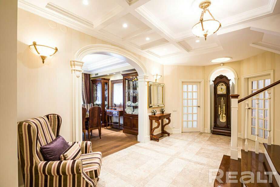 Интерьер дома у него тоже с претензиями. «Дом, как у Пугачевой», — сказал нам риелтор. Это, может быть, и преувеличение, но это не скромная обстановка: карнизы, витражи и даже местами позолота. Фото говорят сами за себя.
