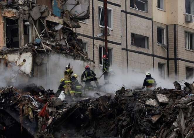 Спасатели разбирают завалы на месте падения российской ракеты в многоэтажный жилой дом в Днепре. 14-15 января 2023 года. Фото: Reuters