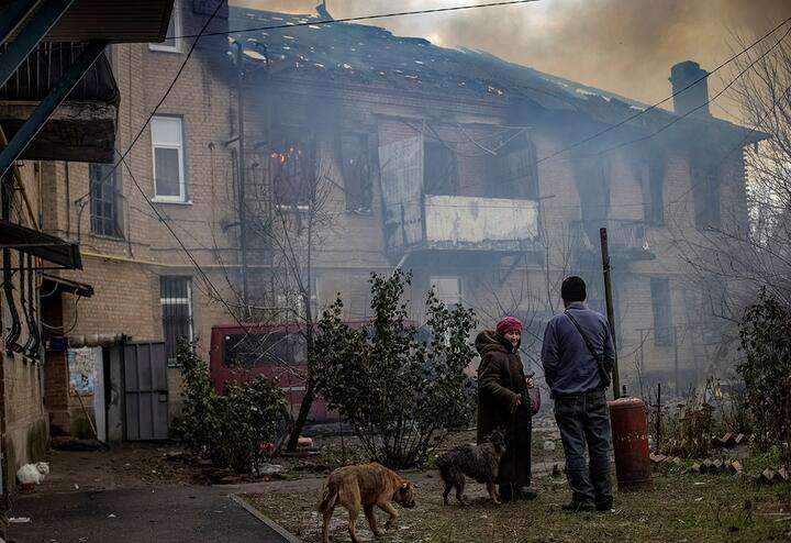 Местные жители во дворе своего разрушенного дома в Бахмуте, Украина, 9 декабря 2022 года. Фото: Reuters