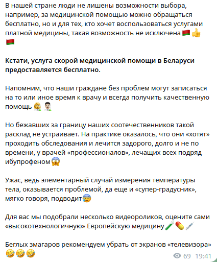 «Но бежавших за границу наших соотечественников такой расклад не устраивает, — заявляется далее. — На практике оказалось, что они «хотят» проходить обследования и лечиться задорого, долго и не по времени у врачей-«профессионалов», лечащих всех подряд ибупрофеном».