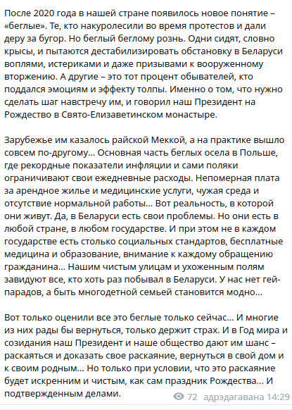 «И в Год мира и созидания наш президент и наше общество дают им шанс — раскаяться и доказать свое раскаяние, вернуться в свой дом и к своим родным… Но только при условии, что это раскаяние будет искренним и чистым, как сам праздник Рождества… И подтвержденным поступками», — советуют идеологи с малой родины Лукашенко.