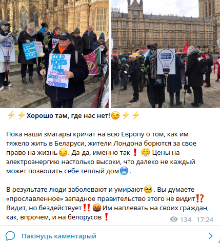 «Цены на электроэнергию настолько высоки, что далеко не каждый может позволить себе теплый дом. В результате люди заболевают и умирают. Вы думаете, что «прославленное» западное правительство этого не видит? Видит, но бездействует. Им наплевать на своих граждан, как, впрочем, и на белорусов», — делают вывод пропагандисты.