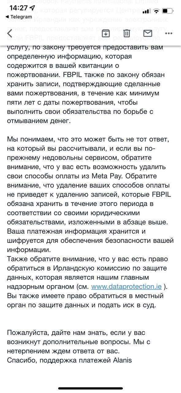 «Возможность доступа к квитанциям о пожертвованиях является ключевой функцией продукта Meta Pay и необходима в соответствии с положениями и условиями платформы», — говорится в ответе представителя Meta.