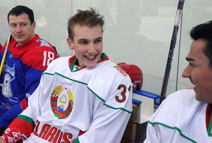Сын Александра Лукашенко Николай разговаривает на скамейке запасных с Дмитрием Басковым во время хоккейного матча, в котором участвуют его отец и Владимир Путин, Сочи, Россия, 7 февраля 2020 года