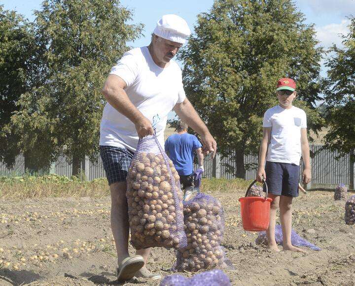 Александр Лукашенко и его сын Николай собирают картофель в поле около резиденции «Дрозды» под Минском, Беларусь, 16 августа 2015 года. Фото: Reuters