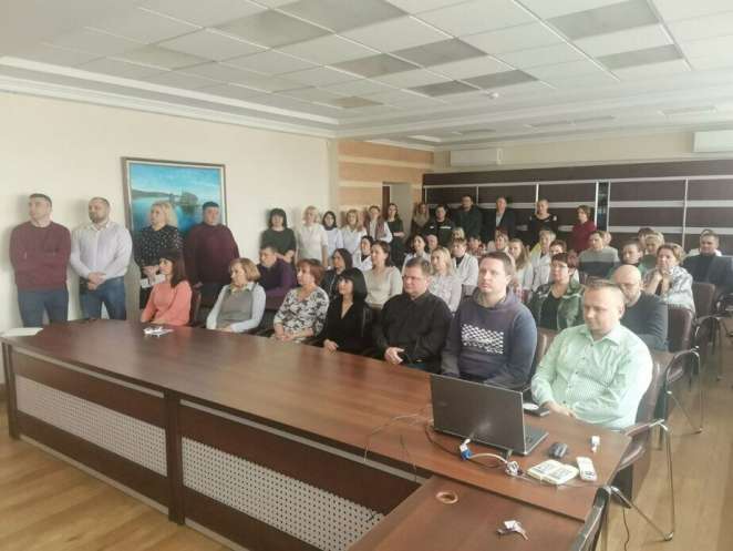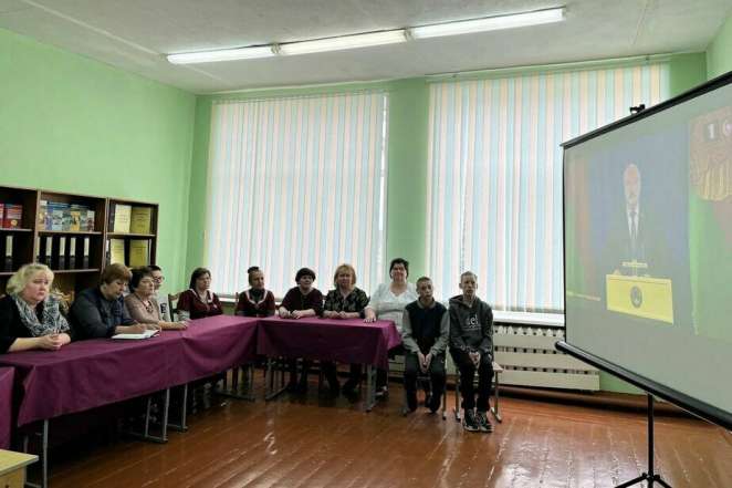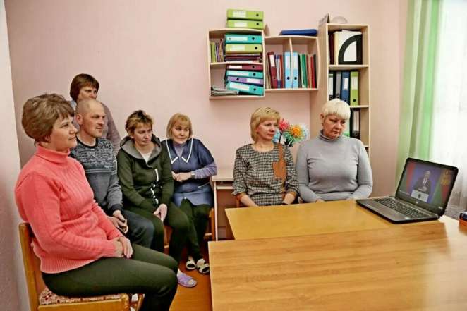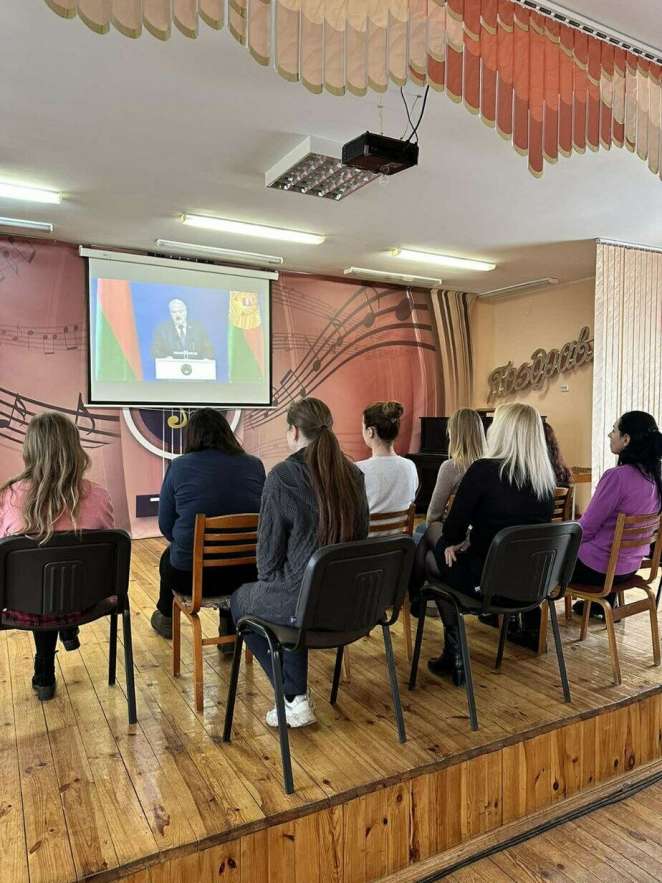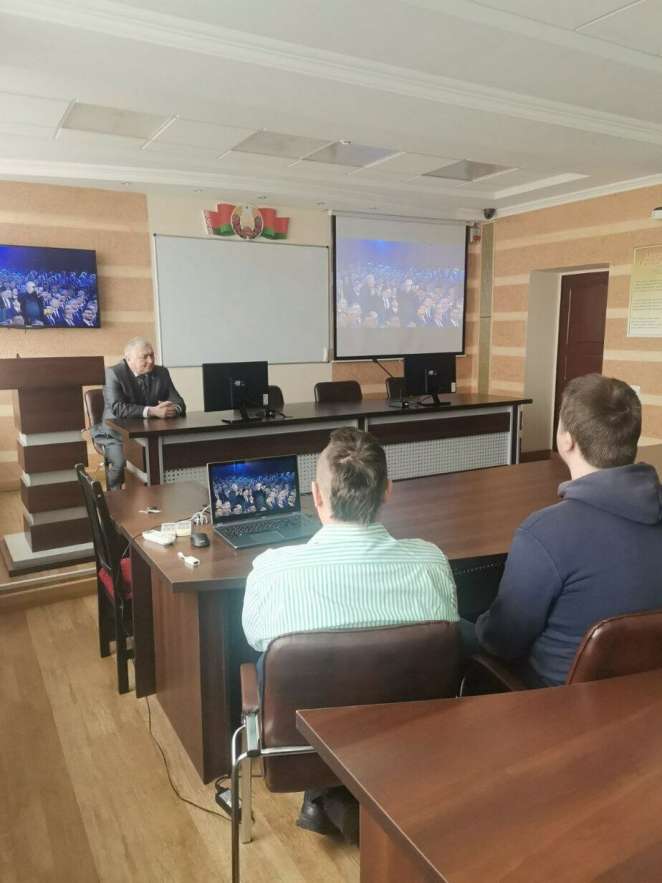 Телеграм-каналы районок стали писать, что выступление Лукашенко слушают трудовые коллективы. На выложенных фото работники показушно сидят в кабинетах руководителей и актовых залах. За ними присматривает ответственный за просмотр. Он сидит отдельно и тоже смотрит в компьютер.