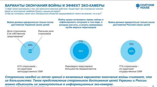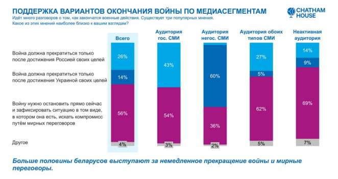 О том, что война должна прекратиться только после достижения Россией своих целей, заявили 26% опрошенных (среди аудитории госСМИ эта доля еще выше — 43%). 14% белорусов полагают, что война должна закончиться на украинских условиях (аудитория госСМИ такой вариант не рассматривает вообще, а вот среди читателей независимых ресурсов эту позицию поддерживают 60%).