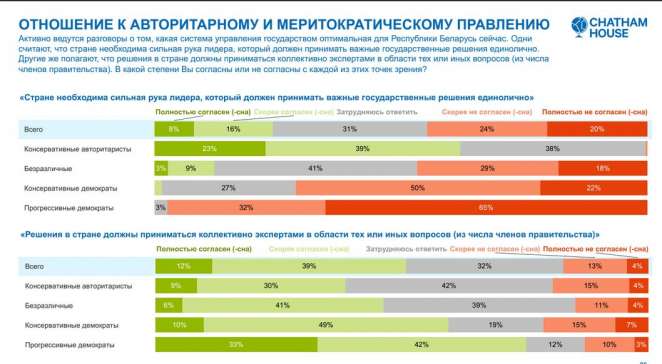 Еще один блок вопросов посвящен ценностным ориентациям белорусов. Что здесь — вызывает ли больше симпатий демократический вектор или авторитарный, или по-прежнему большинство «вне политики»?