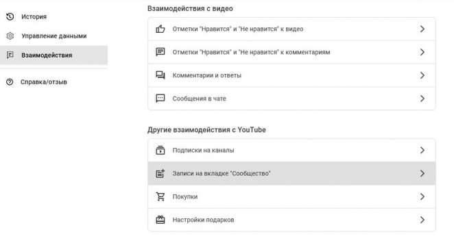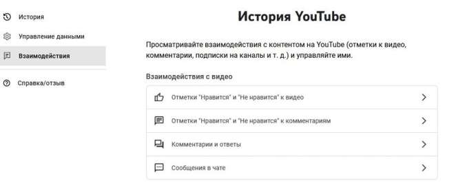 Скриншот меню «Взаимодействия» в «Истории YouTube»
