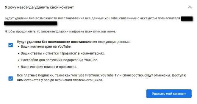 Если вы выберете «Я хочу навсегда удалить свой контент», то удалятся все ваши сведения: лайки, подписки, комментарии, видео и подписчики. Восстановить их будет невозможно и после этого вам придется зарегистрироваться на YouTube заново, чтобы заполучить аккаунт (или не пользоваться аккаунтом ютуба, но тогда вы не сумеете подписываться и лайкать видео).