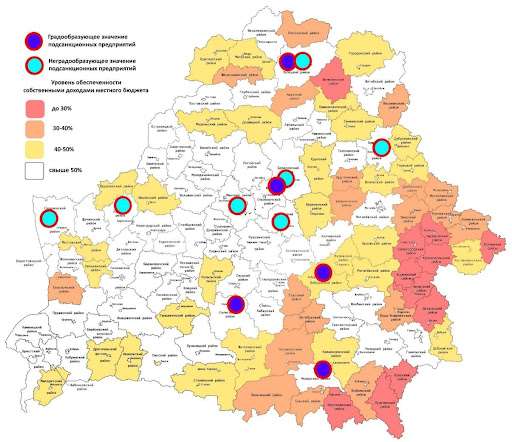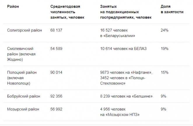 Следуя этой логике, экономика таких городов, как Новополоцк, Жодино, Мозырь, Солигорск и Бобруйск, в значительной мере зависит от эффективности работы находящихся там подсанкционных предприятий. Для Гродно, Лиды, Червеня, Борисова и Орши местные предприятия, попавшие под санкции, не являются градообразующими.