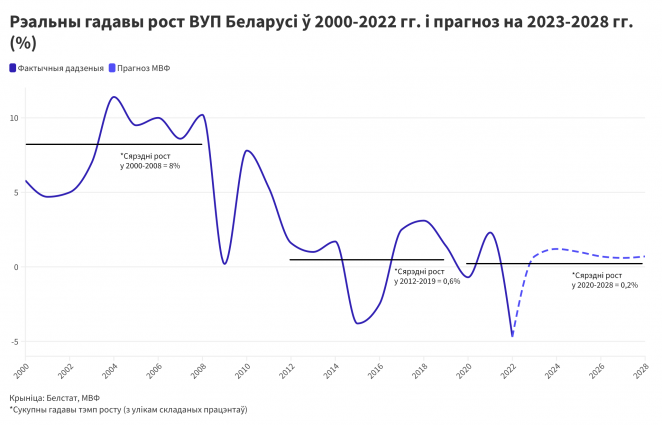 По последнему прогнозу МВФ, в ближайшие шесть лет только три страны во всем мире будут развиваться медленнее, чем Беларусь. В условиях внутриполитического кризиса, экономических санкций, потери украинского рынка, обострения демографических проблем и усиления зависимости от ухудшающейся российской экономики перспективы экономического роста в нашей стране остаются одними из худших в мире.