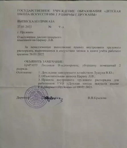 Документ за подписью Крыловой о наложении дисциплинарного взыскания от 27.01.2022 на Людмилу Царану