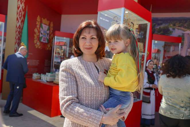 Скриншот видео, где Наталья Кочанова в том же месте и на том же мероприятии дает интервью государственным СМИ, Барановичи, 3 мая 2023 года. Фото: скриншот видео t.me/sovrep
