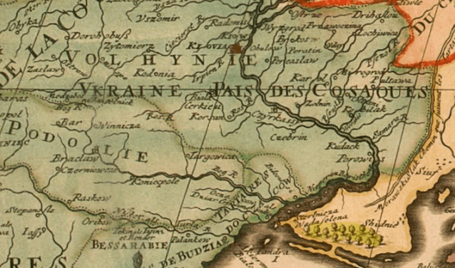 Однако если посмотреть на карту, созданную картографом Гийомом Сансоном, Украина там как раз-таки есть. Она называется «Ukraine pays des cosaques» или «Украина, Земля козаков» в переводе с французского. На тот момент она была частью Речи Посполитой.