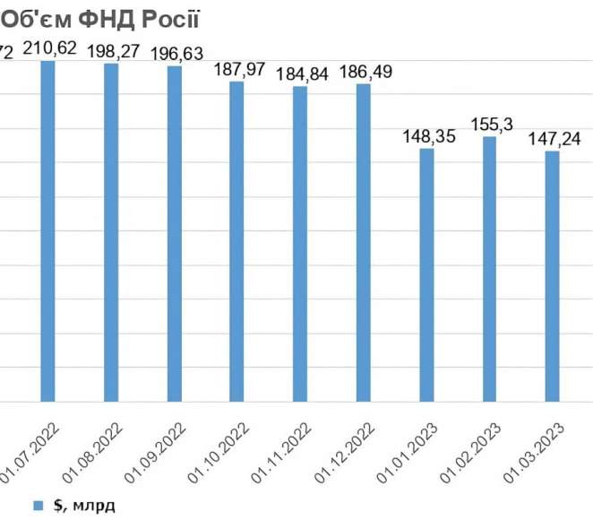 В денежном эквиваленте запасы ФНБ с сентября 2022 г. по февраль т.г. включительно «похудели» на $63,38 млрд, до $147,24 млрд.