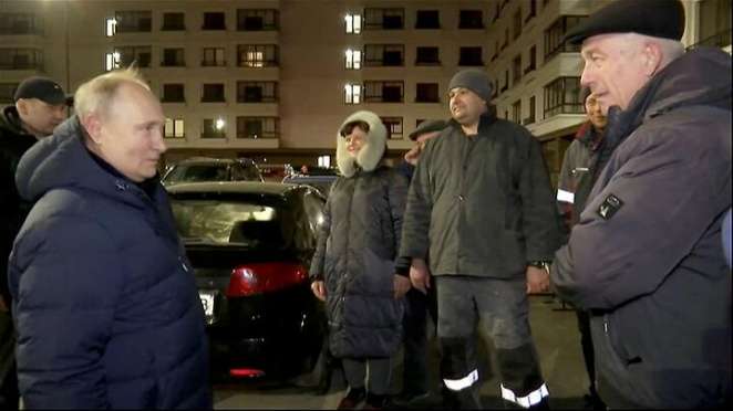 Владимир Путин общается с местными жителями в Мариуполе ночью 19 марта 2023 года. Фото: пресс-служба Кремля
