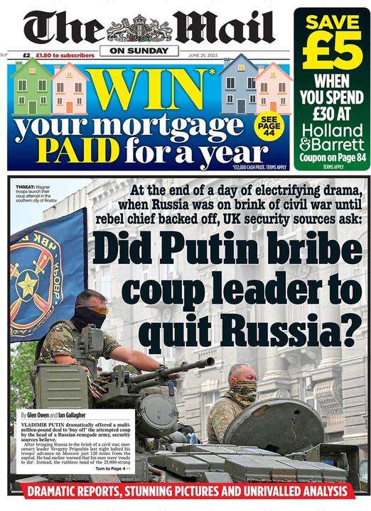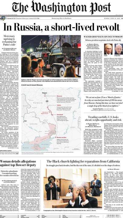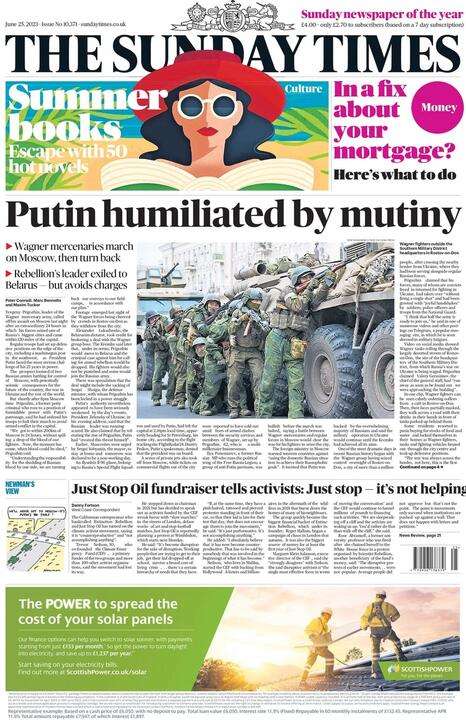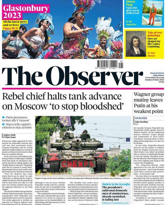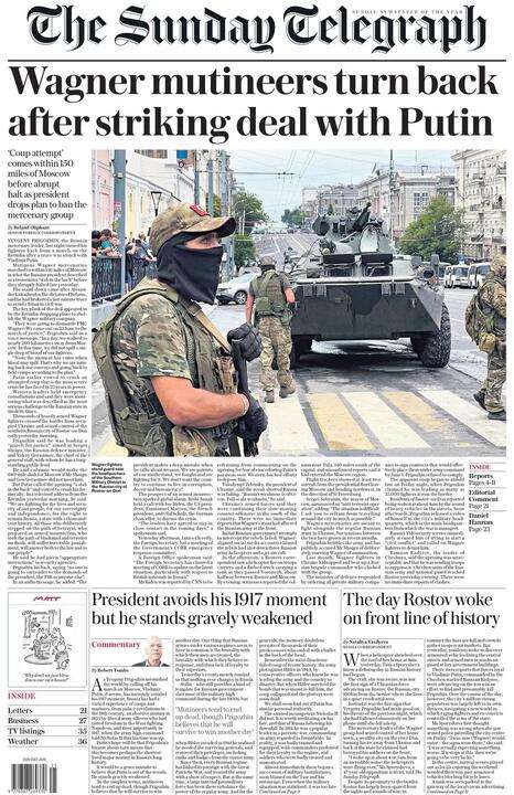 Вся первая полоса Sunday Telegraph — о том, как наемники Вагнера остановили поход на Москву, после того как Пригожин заключил сделку с Путиным. В одном из материалов говорится, что президент России избежал «1917 года», но его позиции «серьезно ослабли». В другом — как Ростов-на-Дону проснулся «на передовой исторического момента».